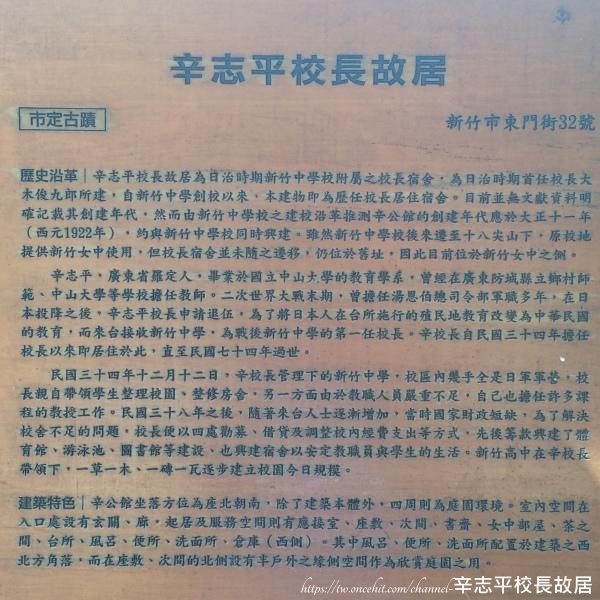 今天是2020/5/13日,來到了辛志平校長故居參觀,在2002年8月1日被定為歷史古蹟,是在新竹市的東區,以前是新竹中學校的校長宿舍,但是是什麼時候建立的呢?目前並無具體的文獻資料有記載,然而新竹中學校推測,是在日治大正11年,也就是西元1922年創建的,大約跟新竹中學校同時興建。